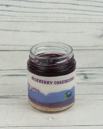 Delicious jar of Philadelphia cream-based cheesecake with buttery cracker base & blueberry topping.