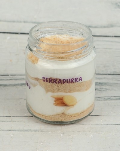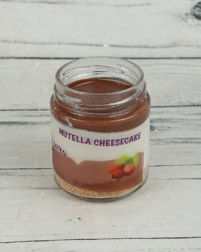 Impeccable jar of Philadelphia cream-based cheesecake with buttery cracker base & nutella topping.