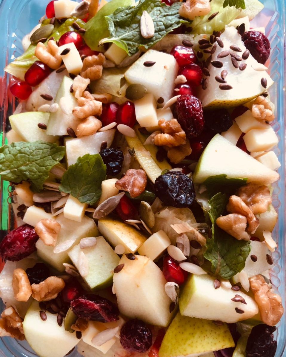 Our Veg Salad is made with fresh seasonal fruits, veggies, green leaves & homemade salad dressing