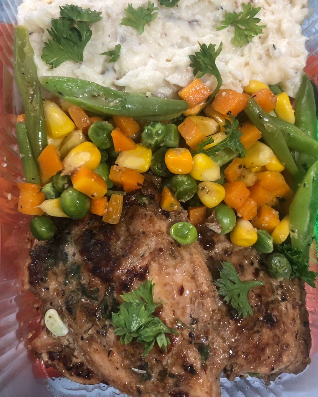 Served with sautéed vegetables & mashed potatoes